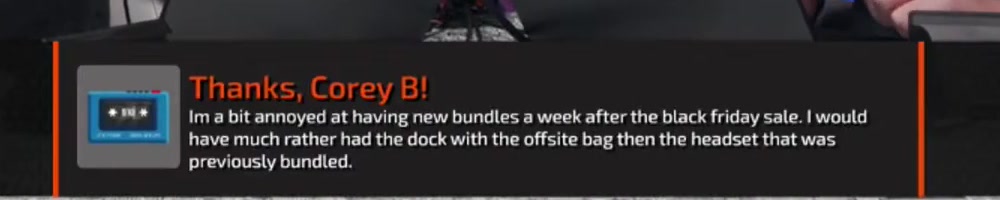 Corey B message Thanks, Corey B! Im a bit annoyed at having new bundles a week after the black friday sale. I would have much rather had the dock with the offsite bag then the headset that was previously bundled. Timestamp