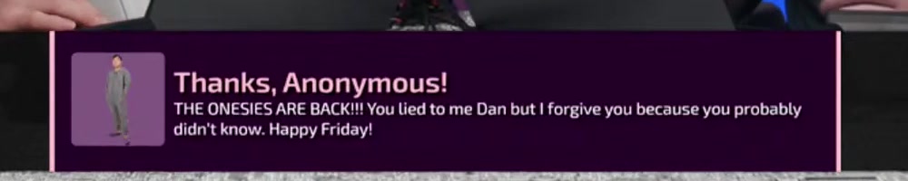 Anonymous message Thanks, Anonymous! THE ONESIES ARE BACK!!! You lied to me Dan but I forgive you because you probably didn't know. Happy Friday! Timestamp