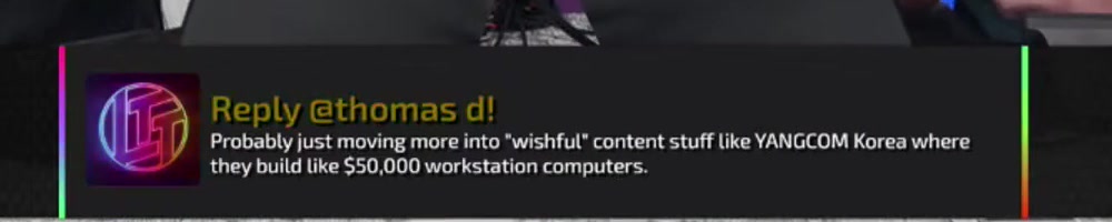 thomas d reply Reply @thomas d! Probably just moving more into "wishful" content stuff like YANGCOM Korea where they build like $50,000 workstation computers. Timestamp
