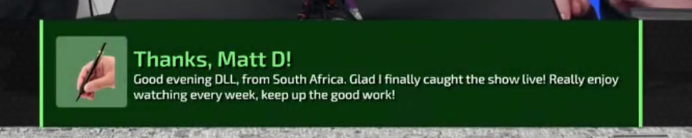 Matt D message Thanks, Matt D! Good evening DLL, from South Africa. Glad I finally caught the show live! Really enjoy watching every week, keep up the good work! Timestamp
