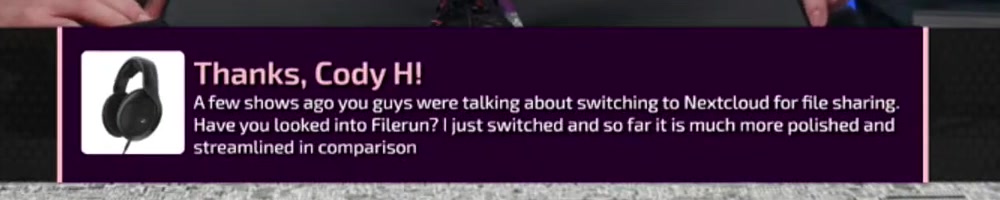 Cody H message Thanks, Cody H! A few shows ago you guys were talking about switching to Nextcloud for file sharing. Have you looked into Filerun? I just switched and so far it is much more polished and streamlined in comparison Timestamp