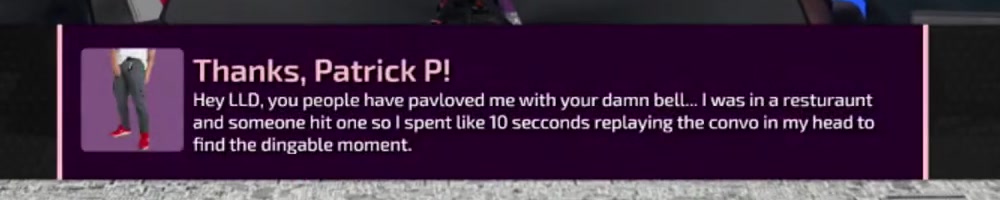 Patrick P message Thanks, Patrick P! Hey LLD, you people have pavloved me with your damn bell... I was in a resturaunt and someone hit one so I spent like 10 secconds replaying the convo in my head to find the dingable moment. Timestamp
