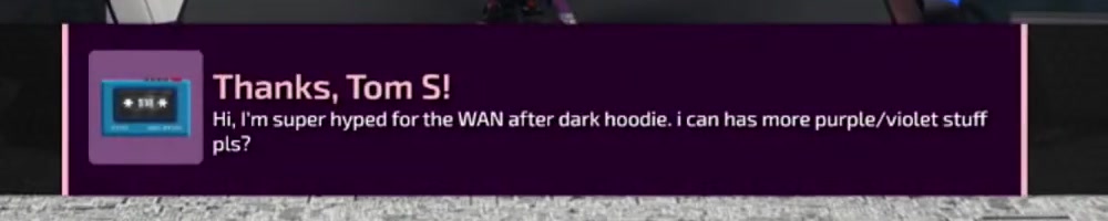 Tom S message Thanks, Tom S! Hi, I'm super hyped for the WAN after dark hoodie. i can has more purple/violet stuff pls? Timestamp