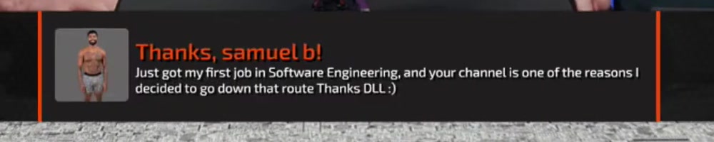 samuel b message Thanks, samuel b! Just got my first job in Software Engineering, and your channel is one of the reasons I decided to go down that route Thanks DLL :) Timestamp