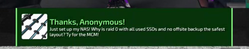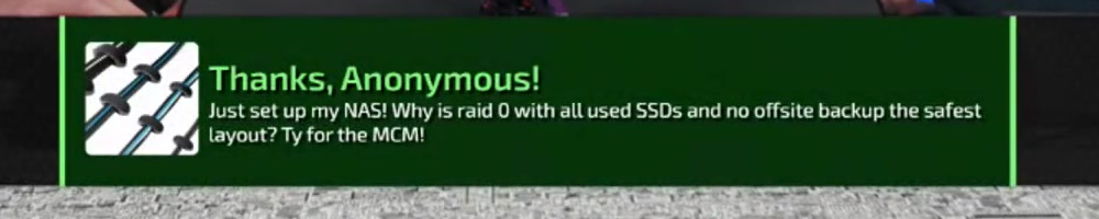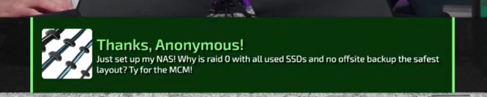 Anonymous message Thanks, Anonymous! Just set up my NAS! Why is raid 0 with all used SSDs and no offsite backup the safest layout? Ty for the MCM! Timestamp