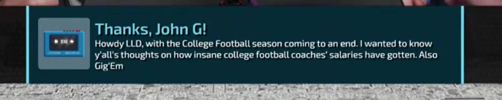 John G message Thanks, John G! Howdy LLD, with the College Football season coming to an end. I wanted to know y'all's thoughts on how insane college football coaches' salaries have gotten. Also Gig'Em Timestamp