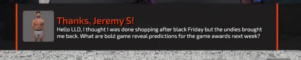 Jeremy S message Thanks, Jeremy S! Hello LLD, I thought I was done shopping after black Friday but the undies brought me back. What are bold game reveal predictions for the game awards next week? Timestamp
