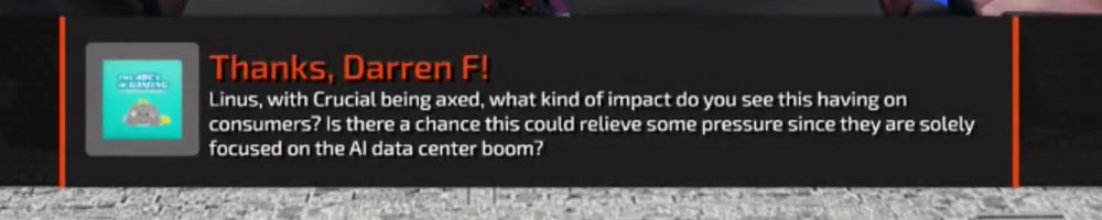 Darren F message Thanks, Darren F! Linus, with Crucial being axed, what kind of impact do you see this having on consumers? Is there a chance this could relieve some pressure since they are solely focused on the Al data center boom? Timestamp