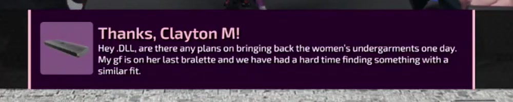 Clayton M message Thanks, Clayton M! Hey .DLL, are there any plans on bringing back the women's undergarments one day. My gf is on her last bralette and we have had a hard time finding something with a similar fit. Timestamp