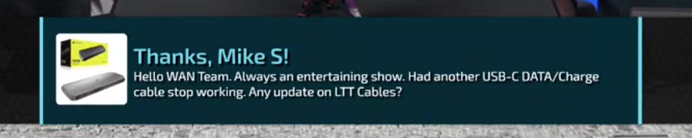 Mike S message Thanks, Mike S! Hello WAN Team. Always an entertaining show. Had another USB-C DATA/Charge cable stop working. Any update on LTT Cables? Timestamp