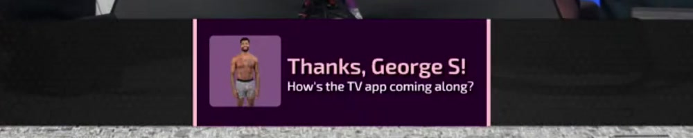 George S message Thanks, George S! How's the TV app coming along? Timestamp