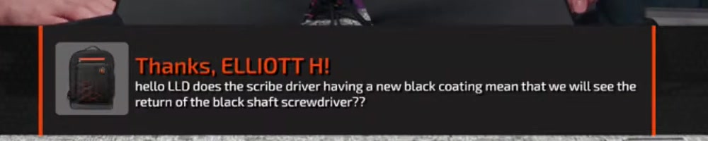 ELLIOTT H message Thanks, ELLIOTT H! hello LLD does the scribe driver having a new black coating mean that we will see the return of the black shaft screwdriver?? Timestamp