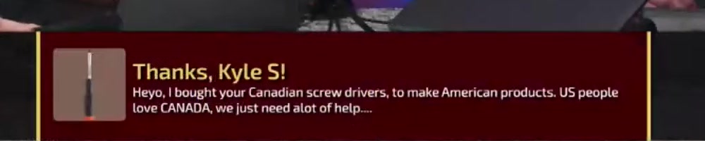 Kyle S message Thanks, Kyle S! Heyo, I bought your Canadian screw drivers, to make American products. US people love CANADA, we just need alot of help.... Timestamp