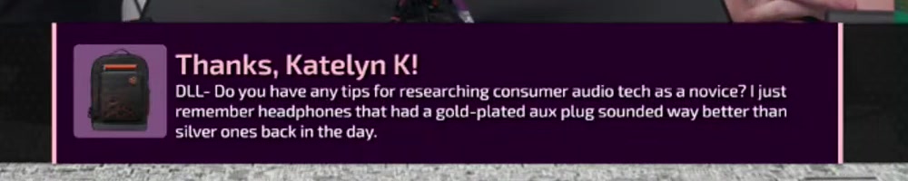 Katelyn K message Thanks, Katelyn K! DLL- Do you have any tips for researching consumer audio tech as a novice? I just remember headphones that had a gold-plated aux plug sounded way better than silver ones back in the day. Timestamp