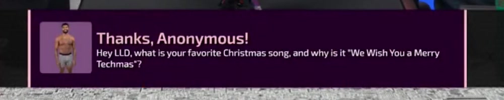 Anonymous message Thanks, Anonymous! Hey LLD, what is your favorite Christmas song, and why is it "We Wish You a Merry Techmas"? 3 Timestamp