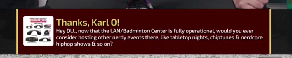 Karl O message Thanks, Karl O! Hey DLL, now that the LAN/Badminton Center is fully operational, would you ever consider hosting other nerdy events there, like tabletop nights, chiptunes & nerdcore hiphop shows & so on? Timestamp