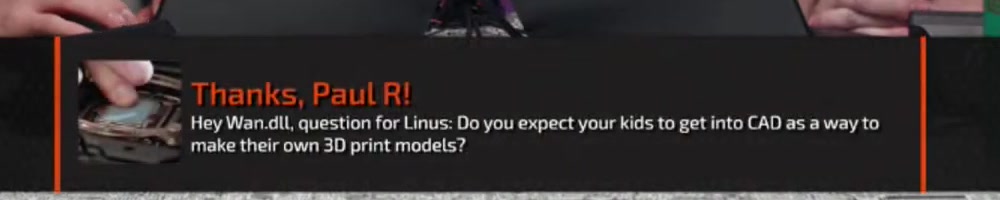 Paul R message Thanks, Paul R! Hey Wan.dll, question for Linus: Do you expect your kids to get into CAD as a way to make their own 3D print models? Timestamp