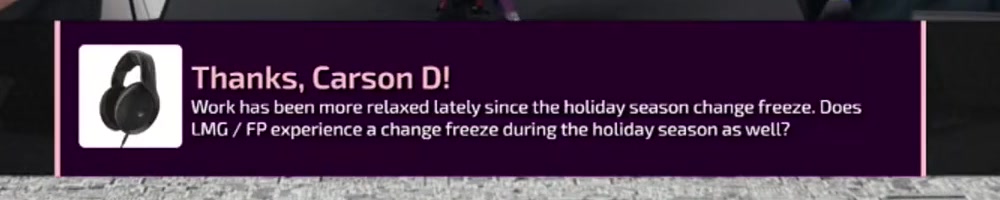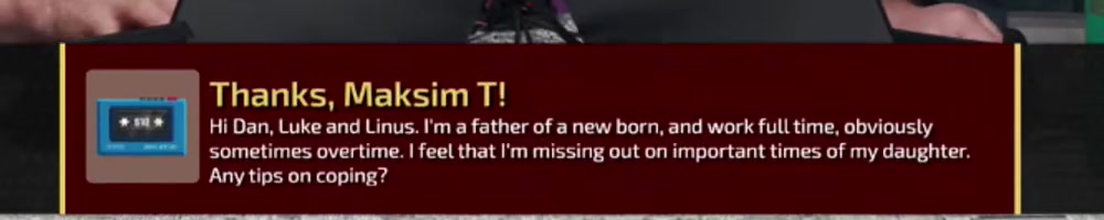 Maksim T message Thanks, Maksim T! Hi Dan, Luke and Linus. I'm a father of a new born, and work full time, obviously sometimes overtime. I feel that I'm missing out on important times of my daughter. Any tips on coping? Timestamp