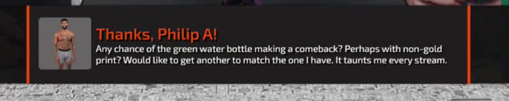 Philip A message Thanks, Philip A! Any chance of the green water bottle making a comeback? Perhaps with non-gold print? Would like to get another to match the one I have. It taunts me every stream. Timestamp