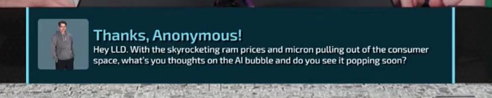 Anonymous message Thanks, Anonymous! Hey LLD. With the skyrocketing ram prices and micron pulling out of the consumer space, what's you thoughts on the Al bubble and do you see it popping soon? Timestamp