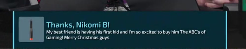 Nikomi B message Thanks, Nikomi B! My best friend is having his first kid and I'm so excited to buy him The ABC's of Gaming! Merry Christmas guys Timestamp