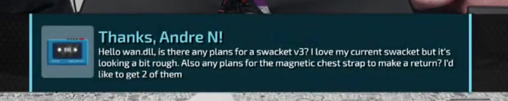 Andre N message Thanks, Andre N! Hello wan.dll, is there any plans for a swacket v3? I love my current swacket but it's looking a bit rough. Also any plans for the magnetic chest strap to make a return? I'd like to get 2 of them Timestamp