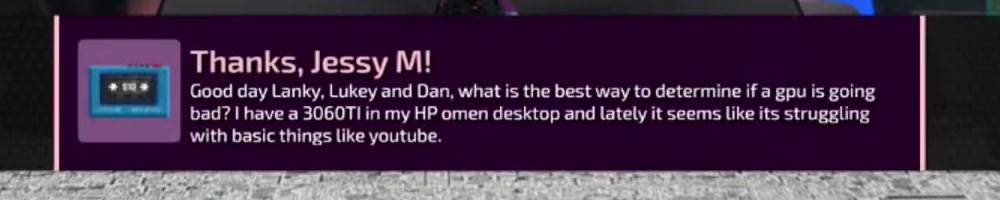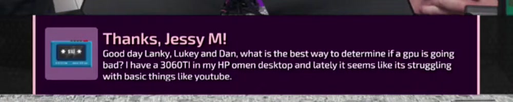 Jessy M message Thanks, Jessy M! Good day Lanky, Lukey and Dan, what is the best way to determine if a gpu is going bad? I have a 3060TI in my HP omen desktop and lately it seems like its struggling with basic things like youtube. Timestamp