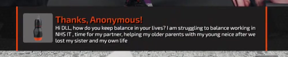 Anonymous message Thanks, Anonymous! Hi DLL, how do you keep balance in your lives? I am struggling to balance working in NHS IT, time for my partner, helping my older parents with my young neice after we lost my sister and my own life Timestamp