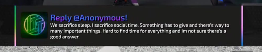 Anonymous reply Reply @Anonymous! We sacrifice sleep. I sacrifice social time. Something has to give and there's way to many important things. Hard to find time for everything and Im not sure there's a good answer. Timestamp