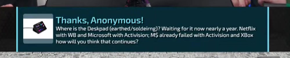 Anonymous message Thanks, Anonymous! Where is the Deskpad (earthed/soldeirng)? Waiting for it now nearly a year. Netflix with WB and Microsoft with Activision; M$ already failed with Activision and XBox how will you think that continues? Timestamp