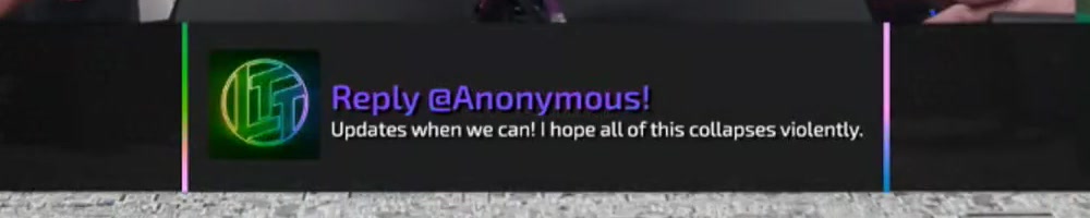 Anonymous reply Reply @Anonymous! Updates when we can! I hope all of this collapses violently. Timestamp