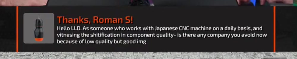 Roman S message Thanks, Roman S! Hello LLD. As someone who works with Japanese CNC machine on a daily basis, and vitnesing the shitification in component quality- is there any company you avoid now because of low quality but good img Timestamp