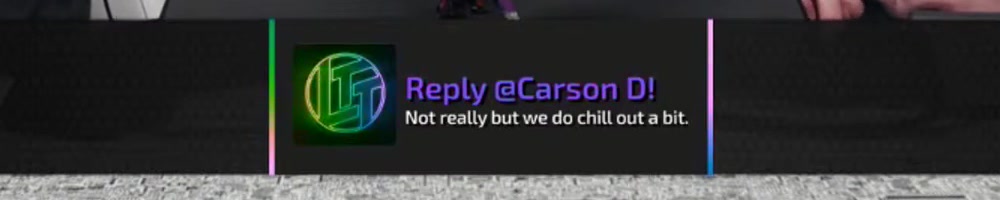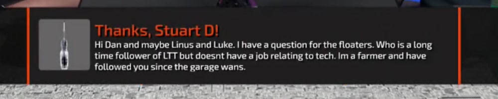 Stuart D message Thanks, Stuart D! Hi Dan and maybe Linus and Luke. I have a question for the floaters. Who is a long time follower of LTT but doesnt have a job relating to tech. Im a farmer and have followed you since the garage wans. Timestamp