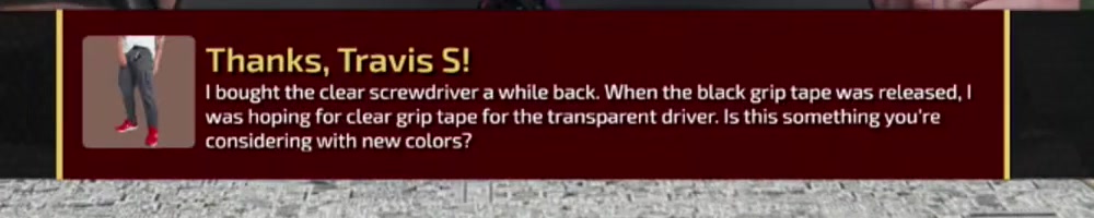 Travis S message Thanks, Travis S! I bought the clear screwdriver a while back. When the black grip tape was released, I was hoping for clear grip tape for the transparent driver. Is this something you're considering with new colors? Timestamp