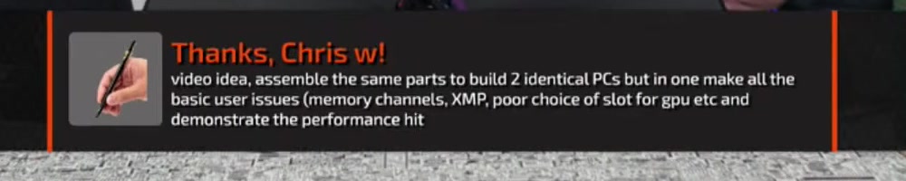 Chris w message Thanks, Chris w! video idea, assemble the same parts to build 2 identical PCs but in one make all the basic user issues (memory channels, XMP, poor choice of slot for gpu etc and demonstrate the performance hit Timestamp