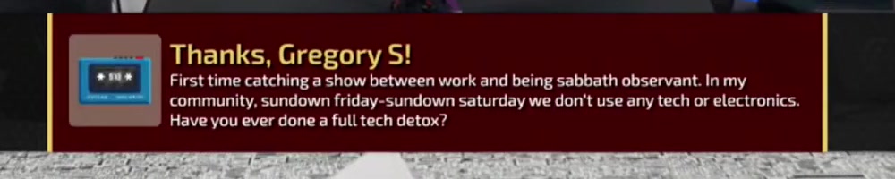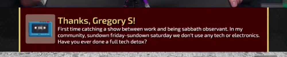 Gregory S message Thanks, Gregory S! First time catching a show between work and being sabbath observant. In my community, sundown friday-sundown saturday we don't use any tech or electronics. Have you ever done a full tech detox? Timestamp
