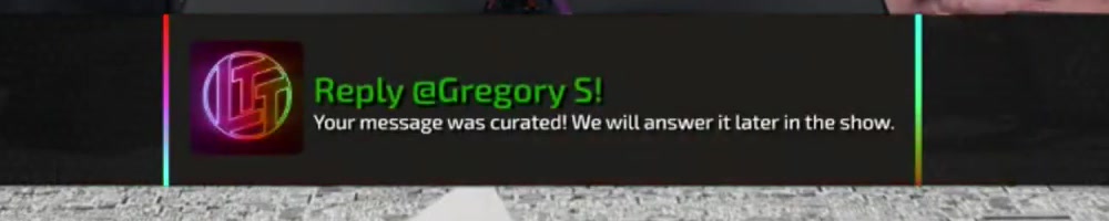 Gregory S reply Reply @Gregory S! Your message was curated! We will answer it later in the show. Timestamp