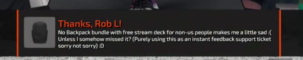 Rob L message Thanks, Rob L! No Backpack bundle with free stream deck for non-us people makes me a little sad :( Unless I somehow missed it? (Purely using this as an instant feedback support ticket sorry not sorry) :D Timestamp