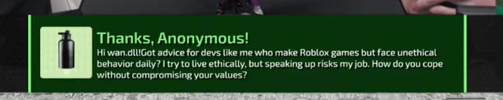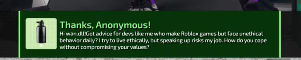 Anonymous message Thanks, Anonymous! Hi wan.dll!Got advice for devs like me who make Roblox games but face unethical behavior daily? I try to live ethically, but speaking up risks my job. How do you cope without compromising your values? Timestamp