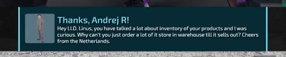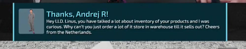 Andrej R message Thanks, Andrej R! Hey LLD. Linus, you have talked a lot about inventory of your products and I was curious. Why can't you just order a lot of it store in warehouse till it sells out? Cheers from the Netherlands. Timestamp