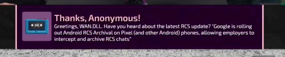 Anonymous message Thanks, Anonymous! Greetings, WAN.DLL. Have you heard about the latest RCS update? "Google is rolling out Android RCS Archival on Pixel (and other Android) phones, allowing employers to intercept and archive RCS chats" Timestamp