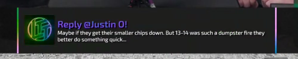 Justin O reply Reply @Justin O! Maybe if they get their smaller chips down. But 13-14 was such a dumpster fire they better do something quick... Timestamp