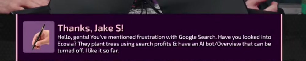 Jake S message Thanks, Jake S! Hello, gents! You've mentioned frustration with Google Search. Have you looked into Ecosia? They plant trees using search profits & have an Al bot/Overview that can be turned off. I like it so far. Timestamp