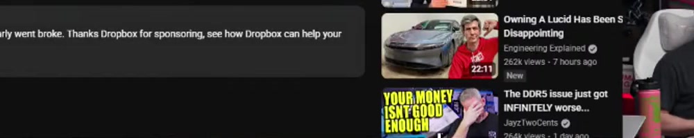 null message Thanks Dropbox for sponsoring, see how Dropbox can help your YOUR MONEY ISNT GOOD ENOUGH 22:11 Owning A Lucid Has Been S Disappointing Engineering Explained 262k views - 7 hours ago New The DDR5 issue just got INFINITELY worse... Jayz TwoCents O 26.4K views - 1 day ann Timestamp