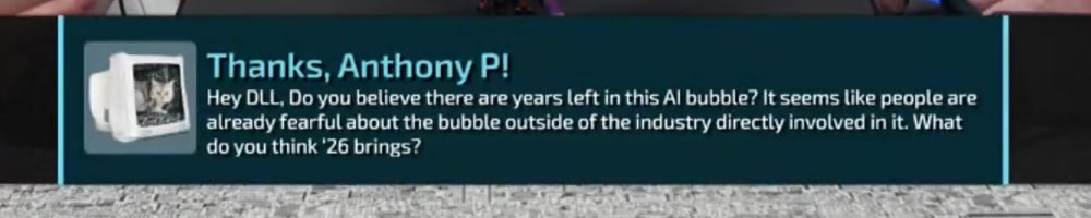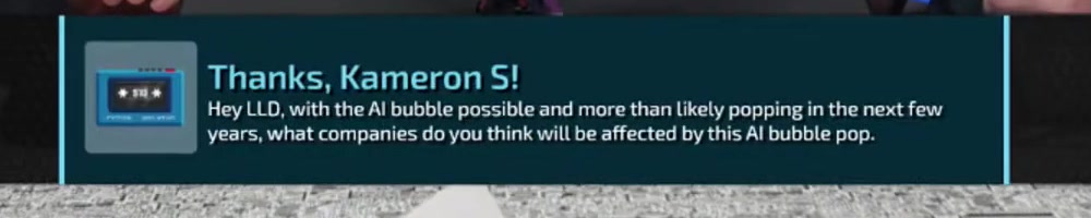 Kameron S message Thanks, Kameron S! Hey LLD, with the Al bubble possible and more than likely popping in the next few years, what companies do you think will be affected by this Al bubble pop. Timestamp