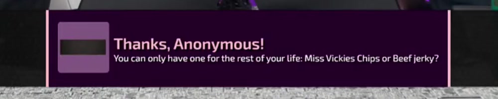 Anonymous message Thanks, Anonymous! You can only have one for the rest of your life: Miss Vickies Chips or Beef jerky? Timestamp