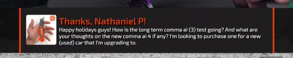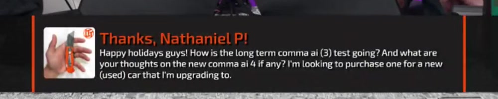 Nathaniel P message Thanks, Nathaniel P! Happy holidays guys! How is the long term comma ai (3) test going? And what are your thoughts on the new comma ai 4 if any? I'm looking to purchase one for a new (used) car that I'm upgrading to. Timestamp