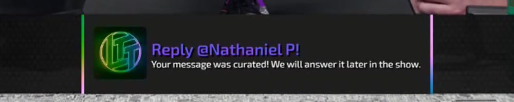 Nathaniel P reply Reply @Nathaniel P! Your message was curated! We will answer it later in the show. Timestamp