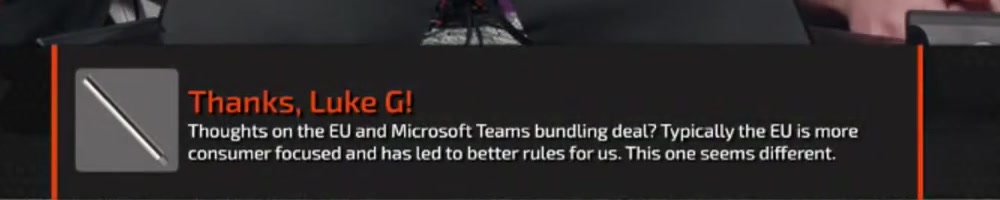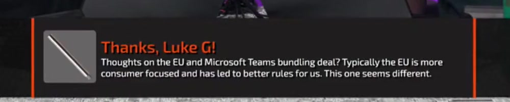 Luke G message Thanks, Luke G! Thoughts on the EU and Microsoft Teams bundling deal? Typically the EU is more consumer focused and has led to better rules for us. This one seems different. Timestamp