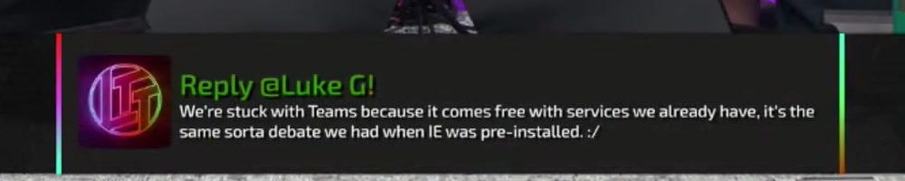 eLuke Gl reply Reply eLuke Gl We're stuck with Teams because it comes free with services we already have, it's the same sorta debate we had when IE was pre-installed. :/ Timestamp